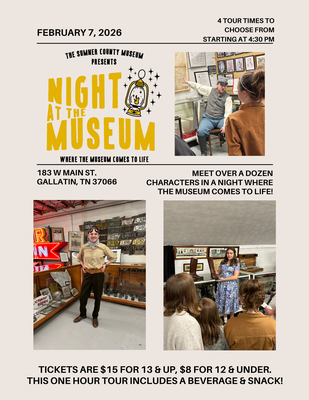 Join us at the Sumner County Museum for an evening where history truly comes alive. Throughout the galleries, over a dozen costumed interpreters will bring our exhibits to life, sharing fascinating stories and unique insights into Sumner County’s past.